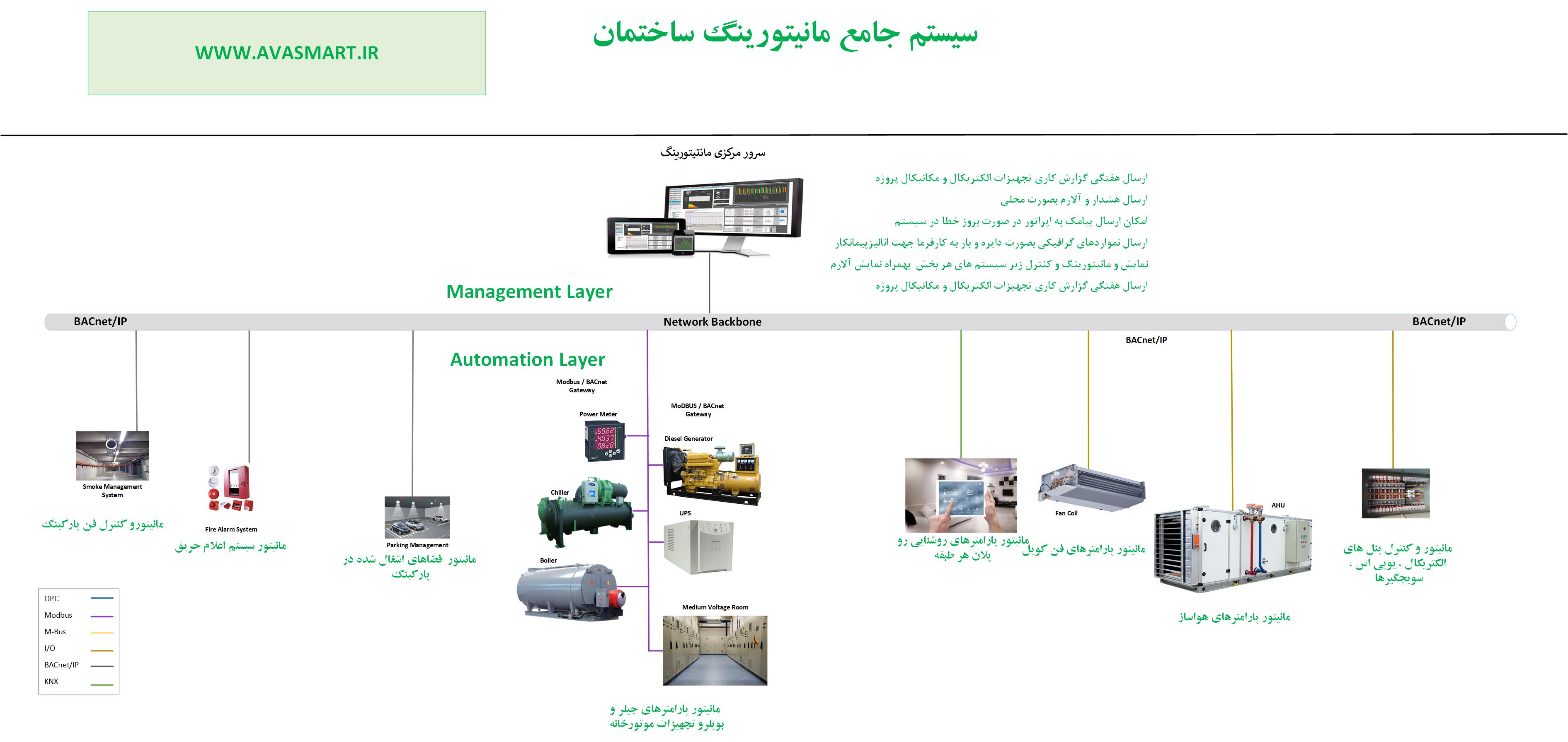 اين سيستم توانايي اجرا بصورت مجزا براي هر پروژه اي را دارد ضمن اينکه سيستم فوق اين قابليت را که در پروژه هاي مختلف بتواند با سيستم هاي پياده شده قبلي با هر پروتکل ارتباطي ترکيب شود وکليه پارامترهاي موجودرا مانيتور نمايدو رويداد هاو گزارش ها را به قسمت مديريت ارسال نمايد . در ذيل به برخي از کاربردهاي اين سيستم بصورت مجزا و ترکيبي با راه حل هاي مختلف اتوماسيون مي پردازيم .